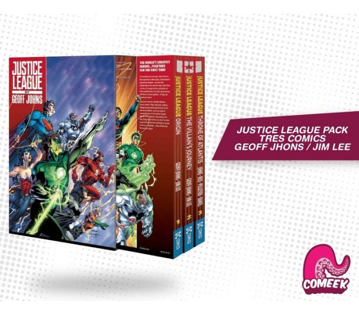 Pack especial Justice League, impreso en inglés por la editorial Dc Usa, edición especial con protector de portada, vienen tres historias: Justice League Origin, The Villan's Journey yThrone of Atlantis.