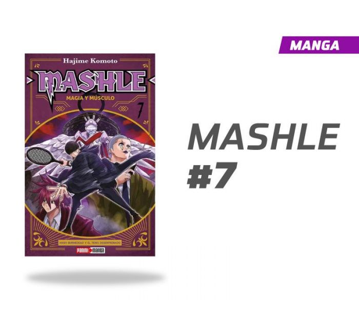 Manga Mashle Músculo y Magia número 7, impreso en español por la editorial Panini México, edición en pasta blanda con solapa, 216 páginas a blanco y negro